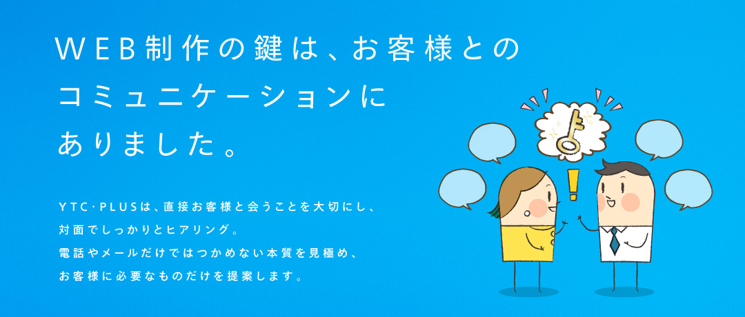 YTC・PLUSは、ホームページ制作をはじめ、社内ITエンジニアによるECサイト構築やアプリ開発を強みをとしています。制作の鍵となるお客様とのコミュニケーションを大切にし、電話やメールだけではつかめない本質を見極め、お客様に必要なものだけを提案します。